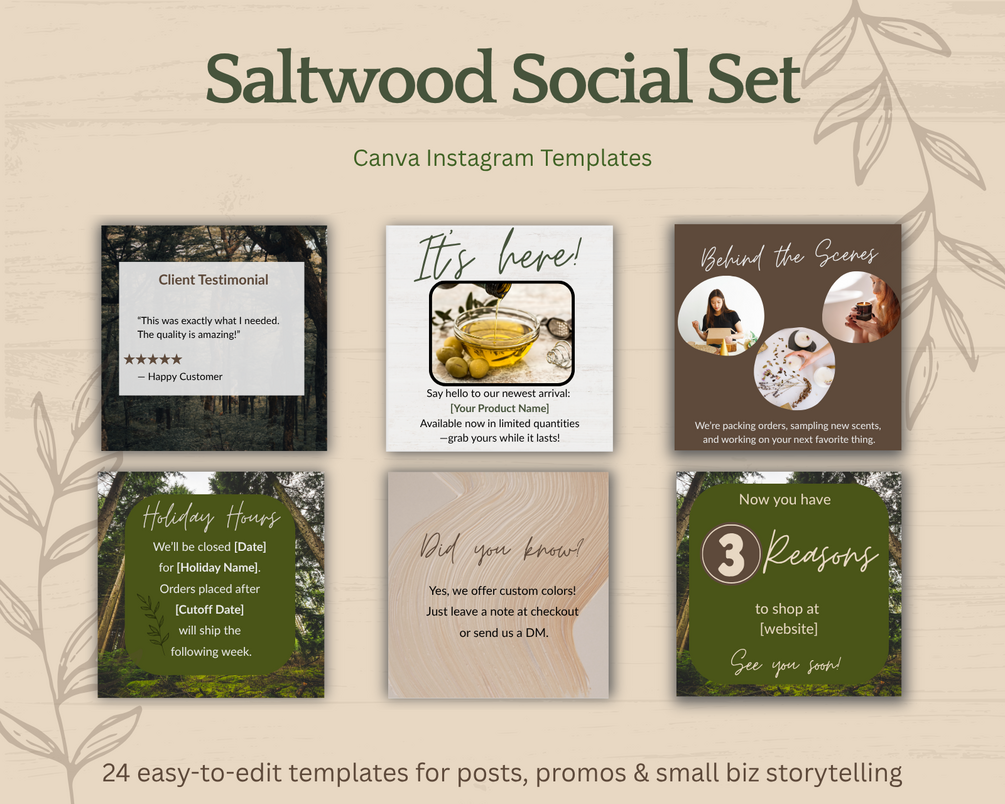 24 editable Canva templates made for small businesses who want to post with purpose. You’ll get 3 versatile sets for promos, storytelling, and client connection — all in the grounded, earthy Saltwood style.