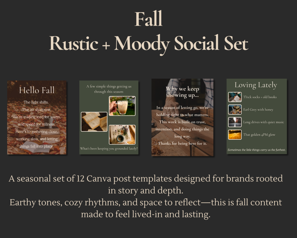 This 12-post Canva template set is designed for small brands, creatives, and service providers who want to share cozy, grounded content with seasonal warmth and thoughtful intention throughout the fall.
